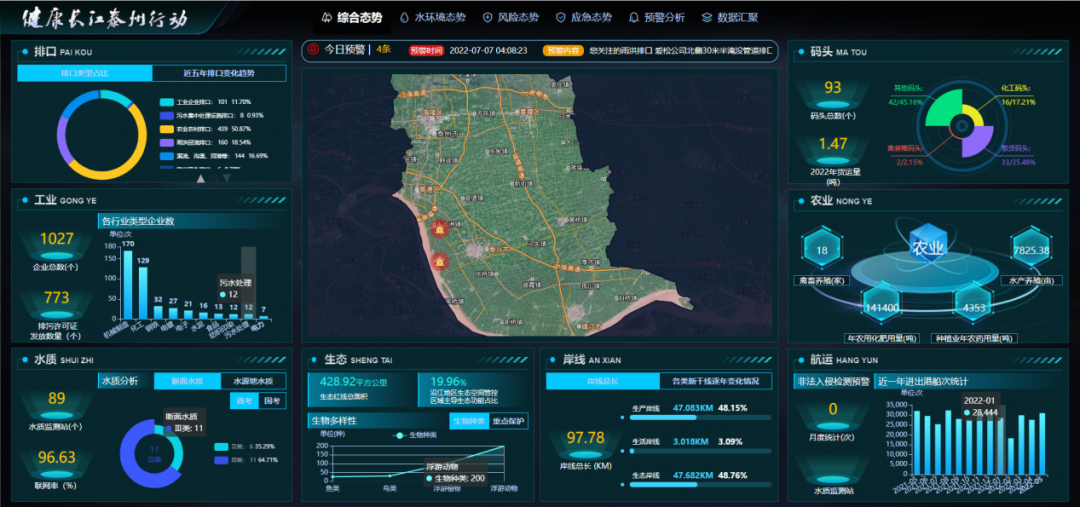 “健康長江泰州行動”大數(shù)據(jù)平臺是泰州市生態(tài)環(huán)境局在全市“長江大體檢”工作中的重大實踐成果。該項目在建設(shè)過程中,以泰州長江入河排污口排查整治及衛(wèi)星遙感監(jiān)測全國試點契機,基于云計算、物聯(lián)網(wǎng)、大數(shù)據(jù)、人工智能、5G等領(lǐng)先技術(shù),積極運用污染源監(jiān)測設(shè)備、高清視頻、無人機、無人船、衛(wèi)星遙感等手段,通過“體檢、診斷、治療、再體檢”等系列措施,創(chuàng)新開展長江生態(tài)環(huán)保工作,取得了顯著成效。