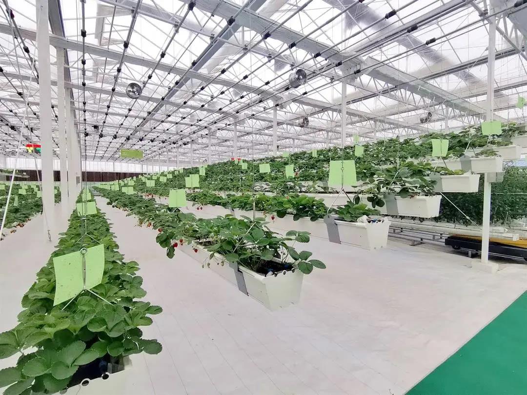 這個“高大上”的智能玻璃溫室占地2800平方米,分為育苗、章姬草莓種植、圣女果種植三個區(qū)域。