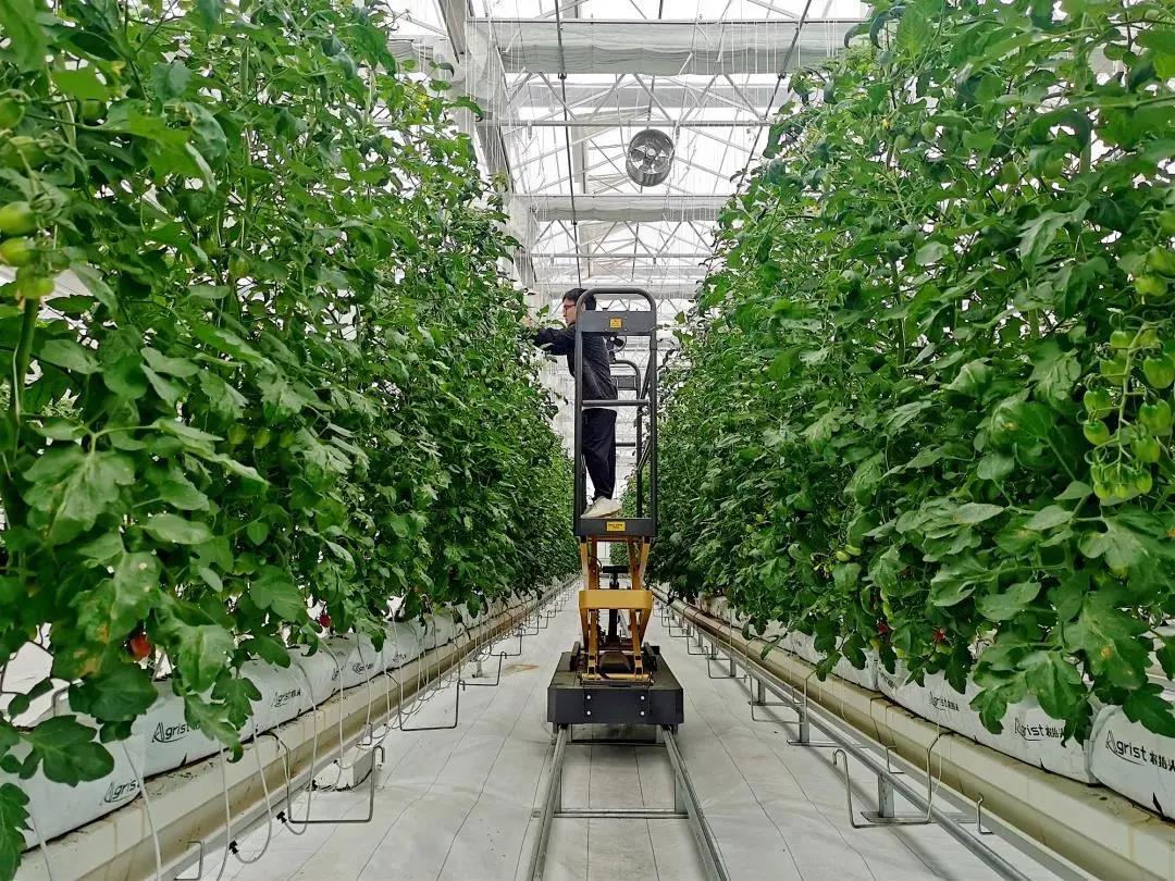 右側的“蔬菜工廠”里,載著工作人員的可移動高空作業(yè)車來回穿梭,忙著給半空中的圣女果整枝。