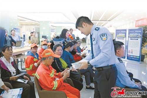 市反詐中心干警在發(fā)放反詐宣傳資料。 受訪單位供圖