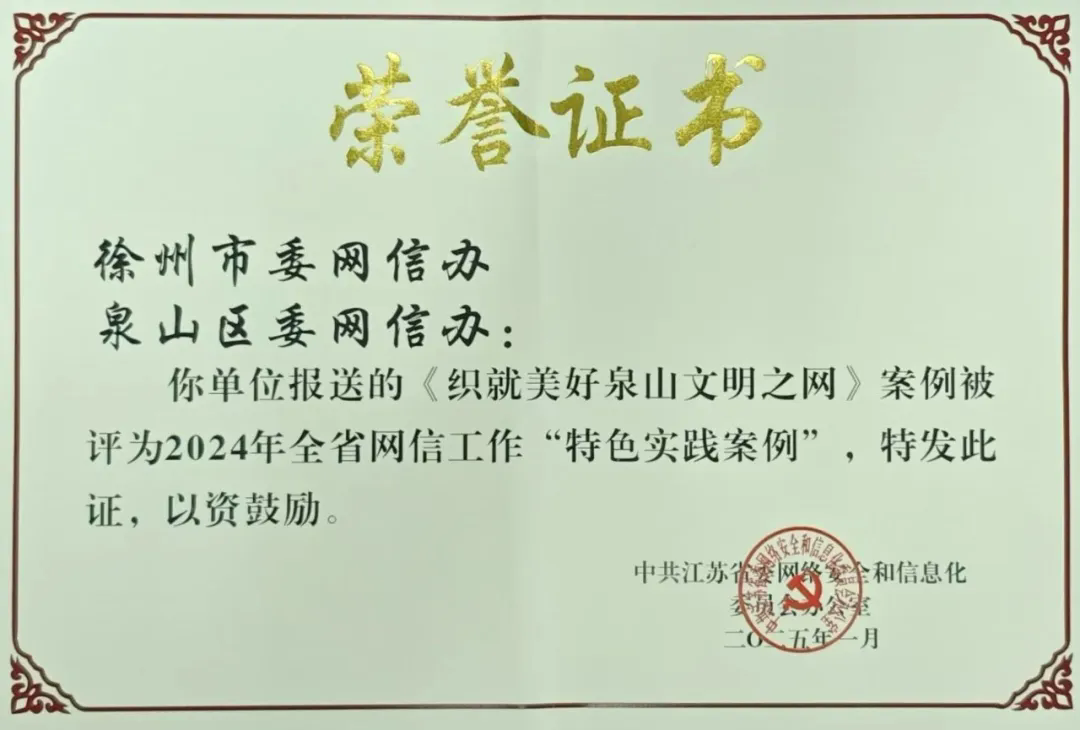 1月10日,全省網(wǎng)信辦主任會(huì)議在寧召開(kāi),會(huì)上通報(bào)了2024年度江蘇省網(wǎng)信工作優(yōu)秀案例。徐州市委網(wǎng)信辦、泉山區(qū)委網(wǎng)信辦報(bào)送的《織就美好泉山文明之網(wǎng)》案例被評(píng)為2024年全省網(wǎng)信工作“特色實(shí)踐案例”。