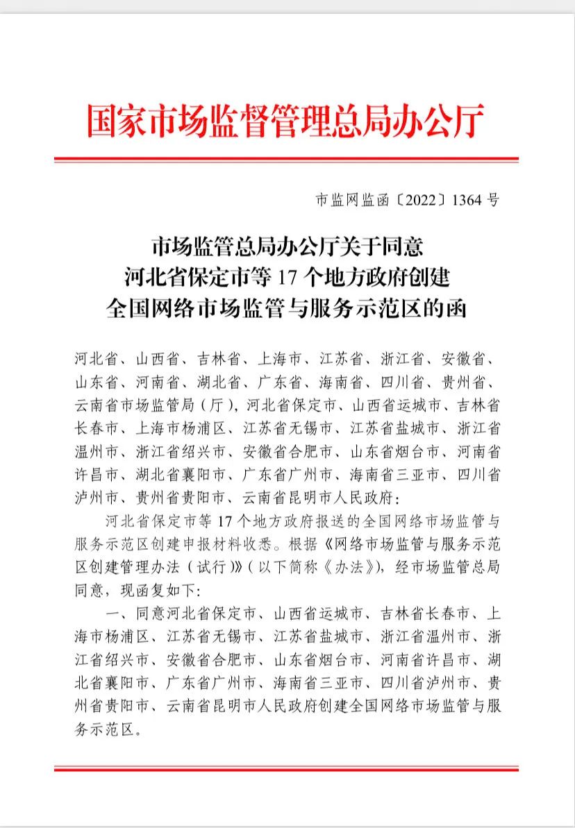 《市場(chǎng)監(jiān)管總局辦公廳關(guān)于同意河北省保定市等17個(gè)地方政府創(chuàng)建全國(guó)網(wǎng)絡(luò)市場(chǎng)監(jiān)管與服務(wù)示范區(qū)的函》中明確,根據(jù)《網(wǎng)絡(luò)市場(chǎng)監(jiān)管與服務(wù)示范區(qū)創(chuàng)建管理辦法(試行)》(以下簡(jiǎn)稱《辦法》),同意河北省保定市、山西省運(yùn)城市、吉林省長(zhǎng)春市、上海市楊浦區(qū)、江蘇省無錫市、江蘇省鹽城市、浙江省溫州市、浙江省紹興市、安徽省合肥市、山東省煙臺(tái)市、河南省許昌市、湖北省襄陽市、廣東省廣州市、海南省三亞市、四川省瀘州市、貴州省貴陽市、云南省昆明市人民政府創(chuàng)建全國(guó)網(wǎng)絡(luò)市場(chǎng)監(jiān)管與服務(wù)示范區(qū)。