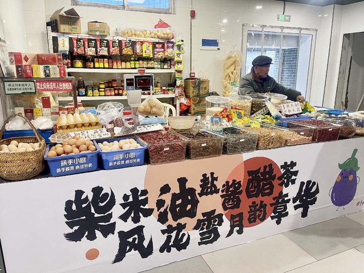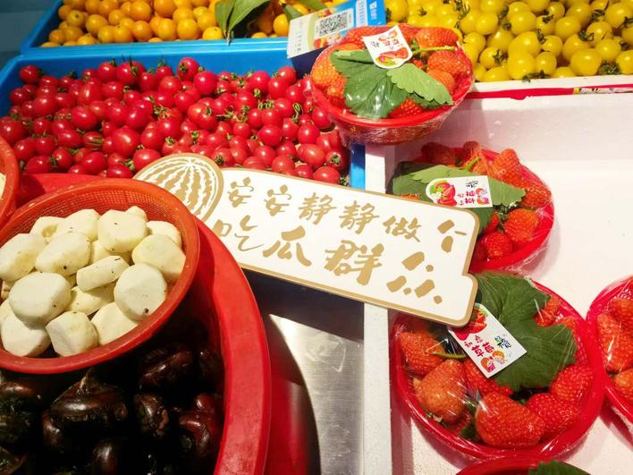 記者注意到,菜市場里充滿了趣味與創(chuàng)意:雜貨鋪的攤位印著“柴米油鹽醬醋茶 風(fēng)花雪月韻章華”的句子;蔬菜攤的西紅柿旁標(biāo)著“當(dāng)紅不讓”;水果攤的小卡牌上則是“安安靜靜做個吃瓜群眾”“藍(lán)莓草莓蔓越莓 小心詐騙聽到?jīng)]”。一個個好玩的諧音梗、網(wǎng)絡(luò)段子,讓人覺得逛菜市場也是一件妙趣橫生的事。