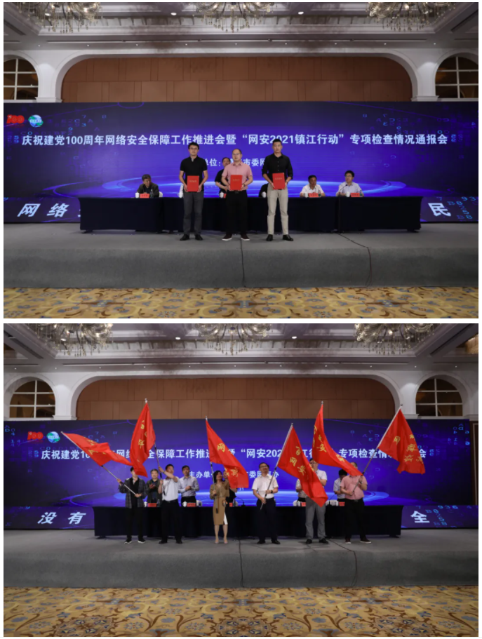百年輝煌,網(wǎng)安護(hù)航!為做好慶祝建黨100周年網(wǎng)絡(luò)安全保障工作,堅(jiān)決防范網(wǎng)絡(luò)安全重點(diǎn)風(fēng)險(xiǎn),堅(jiān)決遏制網(wǎng)絡(luò)安全重大事故,5月31日,鎮(zhèn)江市委網(wǎng)信辦召開慶祝建黨100周年網(wǎng)絡(luò)安全保障工作推進(jìn)會(huì)暨“網(wǎng)安2021鎮(zhèn)江行動(dòng)”專項(xiàng)檢查情況通報(bào)會(huì)。市委機(jī)要局、市工信局、市公安局等單位分管領(lǐng)導(dǎo)到會(huì)并為聯(lián)合檢查隊(duì)伍授旗。市委網(wǎng)信辦主任兼市委宣傳部副部長翟勝勇出席會(huì)議并講話。