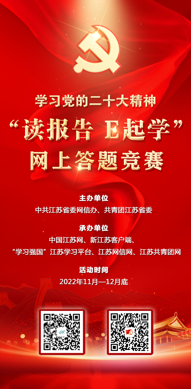 從現(xiàn)在起,中國(guó)共產(chǎn)黨的中心任務(wù)是什么?中國(guó)式現(xiàn)代化包含哪些元素?全面建成社會(huì)主義現(xiàn)代化強(qiáng)國(guó),總的戰(zhàn)略如何安排?……作為“蘇寫(xiě)新篇章 E起向未來(lái)”網(wǎng)絡(luò)主題宣傳活動(dòng)的重磅篇章之一,“讀報(bào)告,E起學(xué)”網(wǎng)上答題競(jìng)賽活動(dòng)今天正式上線啦!即日起到12月底,廣大網(wǎng)民朋友動(dòng)動(dòng)手指不僅可以漲知識(shí),還有機(jī)會(huì)贏取相關(guān)獎(jiǎng)品。