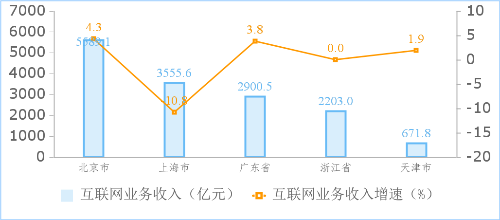 近半數(shù)地區(qū)互聯(lián)網(wǎng)業(yè)務(wù)收入實(shí)現(xiàn)正增長?;ヂ?lián)網(wǎng)業(yè)務(wù)累計(jì)收入居前5名的北京(增長4.3%)、上海(下降10.8%)、廣東(增長3.8%)、浙江(基本持平)和天津(增長1.9%)共完成業(yè)務(wù)收入14920億元,同比下降0.6%,占全國(扣除跨地區(qū)企業(yè))互聯(lián)網(wǎng)業(yè)務(wù)收入的82.7%。全國互聯(lián)網(wǎng)業(yè)務(wù)收入實(shí)現(xiàn)正增長的?。▍^(qū)、市)有13個(gè),其中云南、甘肅增速超80%。