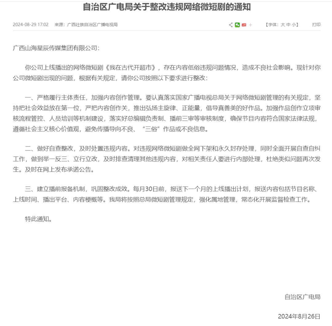 8月29日,廣西壯族自治區(qū)廣播電視局官方網(wǎng)站發(fā)布《自治區(qū)廣電局關(guān)于整改違規(guī)網(wǎng)絡(luò)微短劇的通知》,通知全文如下: