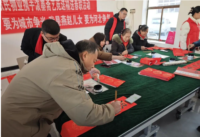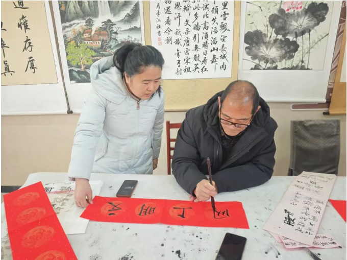 圖為南和區(qū)委網(wǎng)信辦邀請(qǐng)書法家為居民書寫春聯(lián)