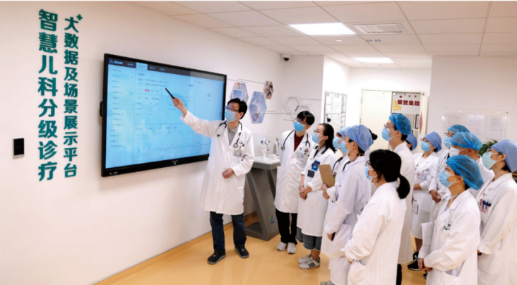 印象中,醫(yī)生總是穿著白大褂,掛著聽診器。小小聽診器中既蘊(yùn)含著醫(yī)者的仁心,也藏著聽者的智慧。走進(jìn)國(guó)家兒童醫(yī)學(xué)中心、上海交通大學(xué)醫(yī)學(xué)院附屬上海兒童醫(yī)學(xué)中心(簡(jiǎn)稱“兒中心”)門診大樓11層,一塊智慧大屏上跳動(dòng)的實(shí)時(shí)數(shù)據(jù),讓交接班的大事小情盡收眼底。