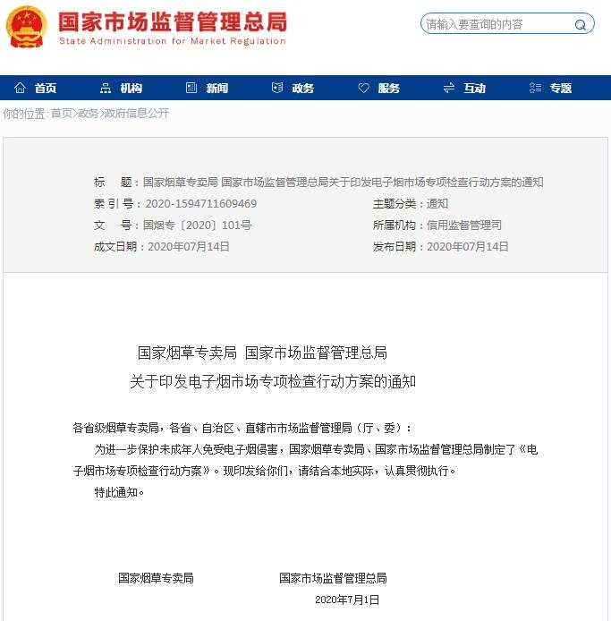 為進(jìn)一步保護(hù)未成年人免受電子煙侵害,國(guó)家煙草專賣局、國(guó)家市場(chǎng)監(jiān)督管理總局制定了《電子煙市場(chǎng)專項(xiàng)檢查行動(dòng)方案》,要求開展互聯(lián)網(wǎng)電子煙信息全面清理,開展電子煙實(shí)體店全面檢查。