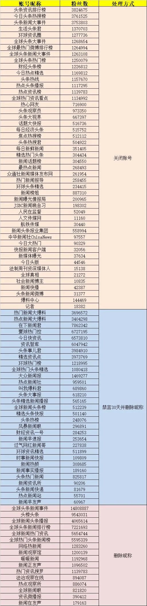 此次公示第三批違規(guī)賬號(hào),共關(guān)閉、禁言、刪除昵稱賬號(hào)104007個(gè),其中百萬粉絲以上的37個(gè),一百萬粉絲到十萬粉絲的40個(gè),十萬粉絲到一萬粉絲的18個(gè)。(附圖為被處置的頭部賬號(hào)名單)