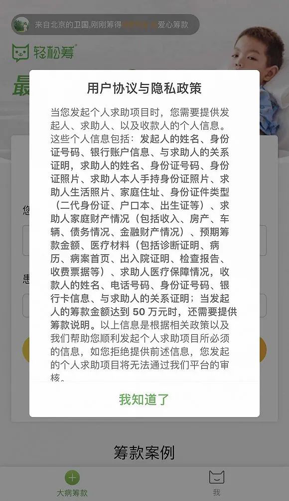 經(jīng)記者體驗,在下載輕松籌APP后,將彈出一份《用戶協(xié)議與隱私政策》。該文件稱,輕松籌APP將通過注冊成為用戶、發(fā)起個人求助項目、個人捐贈服務(wù)、個人求助項目證明以及授權(quán)產(chǎn)品權(quán)限以上六大過程中收集用戶信息。值得注意的是,在發(fā)起個人求助項目時,用戶同意并授權(quán)輕松籌可以收集并使用的信息包括:個人身份證件、家庭住址、醫(yī)療材料和醫(yī)療保障情況、收款人銀行卡賬號等敏感度頗高的隱私信息。