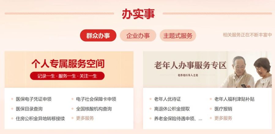 目前,“我為群眾辦實(shí)事,一網(wǎng)通辦解民憂”專欄根據(jù)不同的服務(wù)對象和主題提供多項(xiàng)政務(wù)服務(wù)。專欄的“辦實(shí)事”板塊涵蓋“群眾辦事”“企業(yè)辦事”和“主題式服務(wù)”三個方面,提供“個人專屬服務(wù)空間”“老年人辦事服務(wù)專區(qū)”“企業(yè)專屬服務(wù)空間”“‘跨省通辦’服務(wù)專區(qū)”等多個集成式政務(wù)服務(wù),還將根據(jù)群眾意見不斷豐富為企業(yè)和群眾辦實(shí)事的服務(wù)事項(xiàng)。
