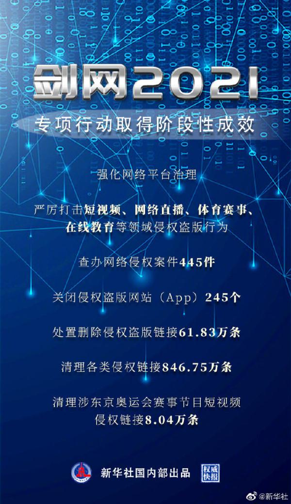 國家版權(quán)局、工業(yè)和信息化部、公安部、國家互聯(lián)網(wǎng)信息辦公室四部門今年6月聯(lián)合啟動(dòng)打擊網(wǎng)絡(luò)侵權(quán)盜版“劍網(wǎng)2021”專項(xiàng)行動(dòng)。截至目前,各級(jí)版權(quán)執(zhí)法監(jiān)管部門查辦網(wǎng)絡(luò)侵權(quán)案件445件,關(guān)閉侵權(quán)盜版網(wǎng)站(App)245個(gè),處置刪除侵權(quán)盜版鏈接61.83萬條,推動(dòng)網(wǎng)絡(luò)視頻、網(wǎng)絡(luò)直播、電子商務(wù)等相關(guān)網(wǎng)絡(luò)服務(wù)商清理各類侵權(quán)鏈接846.75萬條,主要短視頻平臺(tái)清理涉東京奧運(yùn)會(huì)賽事節(jié)目短視頻侵權(quán)鏈接8.04萬條。
