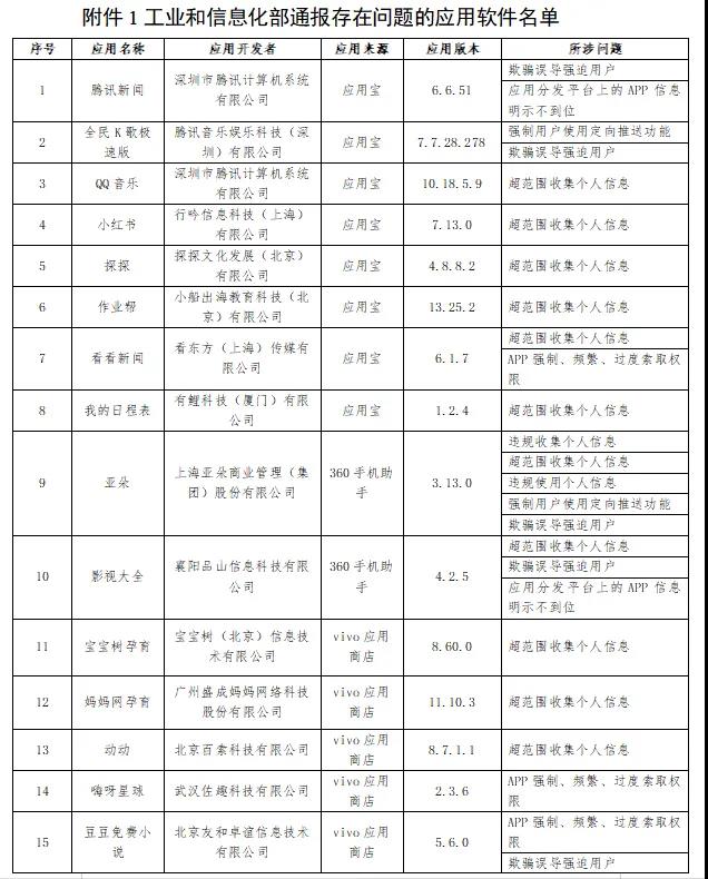 工業(yè)和信息化部通報(bào)存在問題的應(yīng)用軟件名單。部分名單截圖