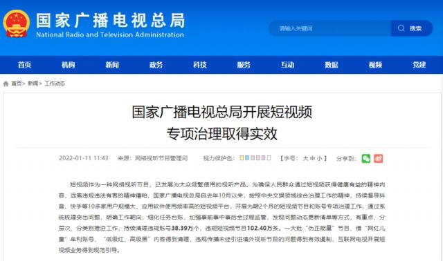 文中稱,短視頻作為一種網(wǎng)絡(luò)視聽節(jié)目,已發(fā)展為大眾頻繁使用的視聽產(chǎn)品。國家廣電總局自去年10月以來,按照中央文娛領(lǐng)域綜合治理工作的精神,持續(xù)督導(dǎo)抖音、快手等10多家用戶規(guī)模大、應(yīng)用軟件使用頻率高的短視頻平臺,開展為期2個月的短視頻節(jié)目和賬號專項(xiàng)治理工作。
