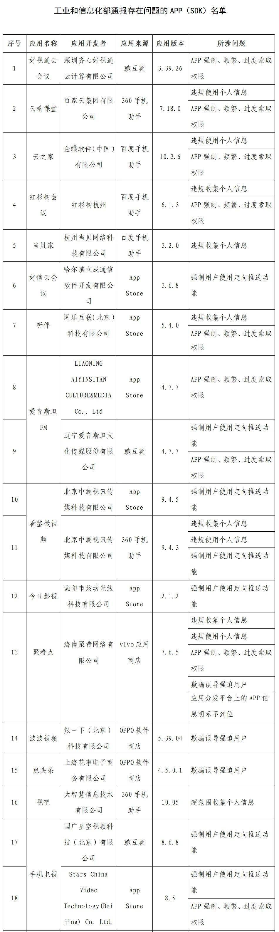 附件:工業(yè)和信息化部通報(bào)存在問題的APP(SDK)名單