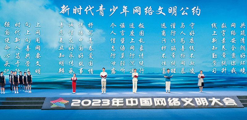 黨的十八大以來,習(xí)近平總書記圍繞加強(qiáng)網(wǎng)絡(luò)文明建設(shè)、共建網(wǎng)上美好精神家園發(fā)表一系列重要論述,深刻揭示了網(wǎng)絡(luò)文明建設(shè)的規(guī)律。圖為2023年7月18日,在福建省廈門市舉行的2023年中國網(wǎng)絡(luò)文明大會主論壇發(fā)布《新時代青少年網(wǎng)絡(luò)文明公約》。 新華社記者 林善傳/攝