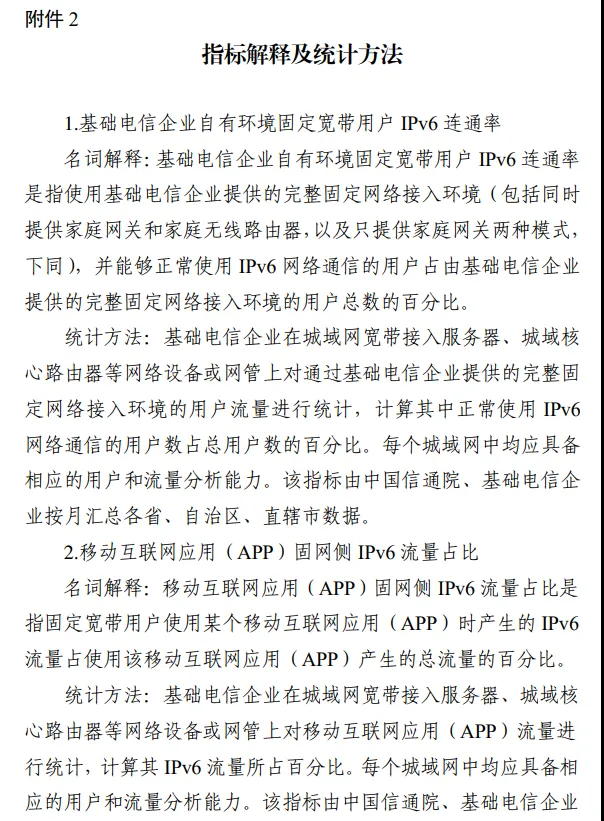 五、加強(qiáng)督促評(píng)測(cè),促進(jìn)工作實(shí)效落地。基礎(chǔ)電信企業(yè)集團(tuán)公司要對(duì)開展“網(wǎng)絡(luò)去NAT”試點(diǎn)工作的子(分)公司給予必要政策傾斜和資金保障。要不斷豐富監(jiān)測(cè)技術(shù)手段,構(gòu)建監(jiān)測(cè)體系,按月開展分省基礎(chǔ)電信企業(yè)自有環(huán)境固定寬帶用戶IPv6連通率、移動(dòng)互聯(lián)網(wǎng)應(yīng)用(APP)固網(wǎng)側(cè)IPv6流量占比、內(nèi)容分發(fā)網(wǎng)絡(luò)(CDN)IPv6流量占比(附件2)等指標(biāo)統(tǒng)計(jì)。工業(yè)和信息化部、中央網(wǎng)信辦將適時(shí)組織公布相關(guān)監(jiān)測(cè)結(jié)果。各?。▍^(qū)、市)通信管理局、工業(yè)和信息化主管部門要強(qiáng)化行業(yè)管理,加強(qiáng)工作指導(dǎo)。各省級(jí)網(wǎng)信辦要督促互聯(lián)網(wǎng)企業(yè)加強(qiáng)協(xié)同,合力推動(dòng)“網(wǎng)絡(luò)去NAT”目標(biāo)完成。