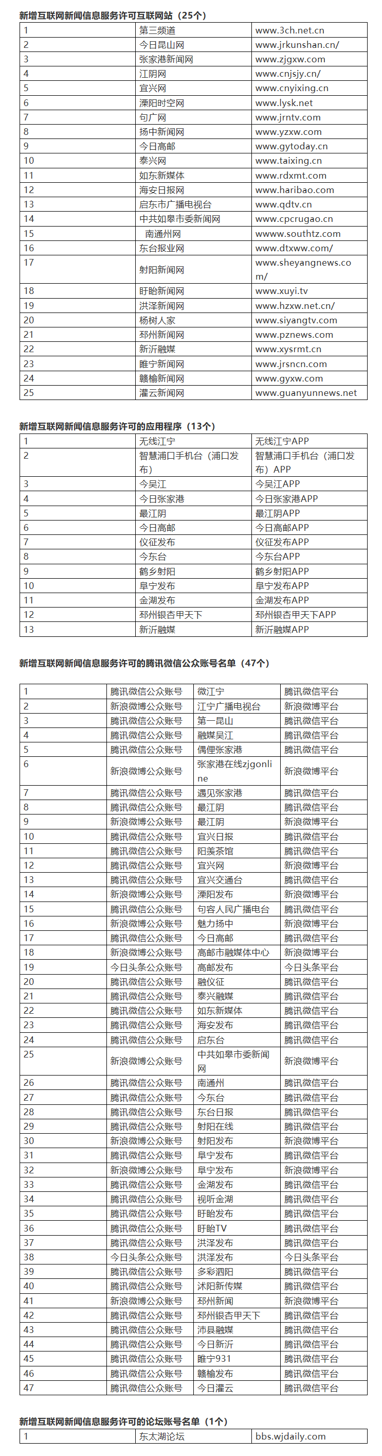 近日,江蘇省互聯網信息辦公室依法批準32家縣級融媒體中心互聯網新聞信息服務單位許可。這32家分別是江寧區(qū)融媒體中心、浦口區(qū)融媒體中心、昆山市融媒體中心、吳江區(qū)融媒體中心、張家港市融媒體中心、江陰市融媒體中心、宜興市融媒體中心、溧陽市融媒體中心、句容市融媒體中心、揚中市融媒體中心、高郵市融媒體中心、儀征市融媒體中心、泰興市融媒體中心、如東縣融媒體中心、海安市融媒體中心、啟東市融媒體中心、如皋市融媒體中心、通州區(qū)融媒體中心、東臺市融媒體中心、射陽縣融媒體中心、阜寧縣融媒體中心、金湖縣融媒體中心、盱眙縣融媒體中心、洪澤區(qū)融媒體中心、泗陽縣融媒體中心、沭陽縣融媒體中心、邳州市融媒體中心、沛縣融媒體中心、新沂市融媒體中心、睢寧縣融媒體中心、贛榆區(qū)融媒體中心、灌云縣融媒體中心 。新增服務形式包括:互聯網站25個,應用程序13個,公眾賬號47個、論壇1個,共計86個服務項。