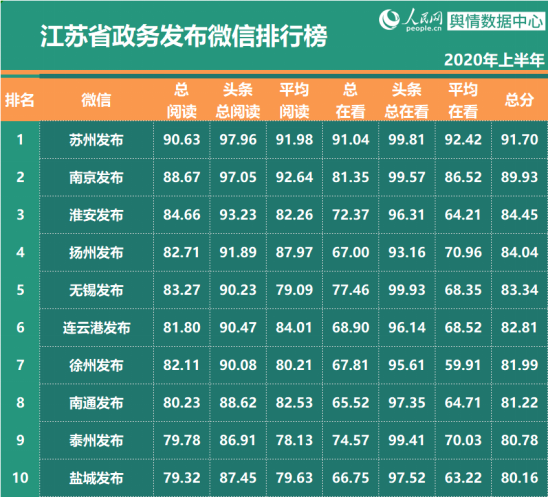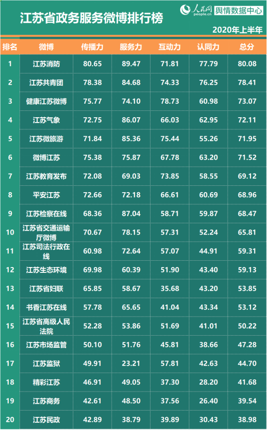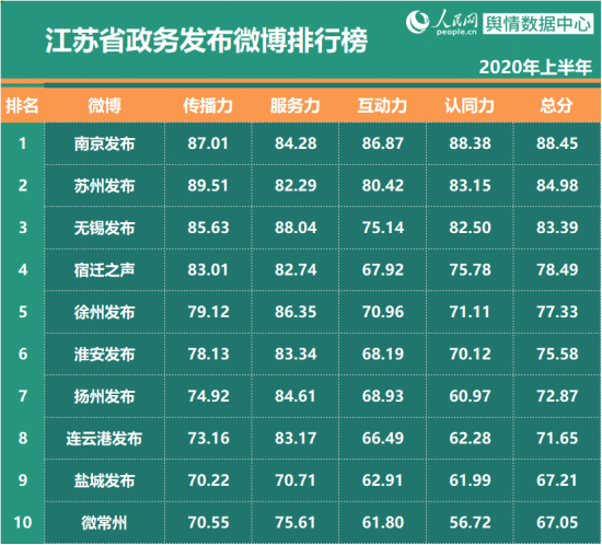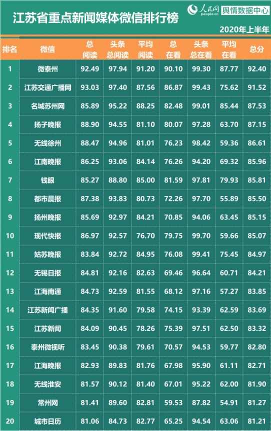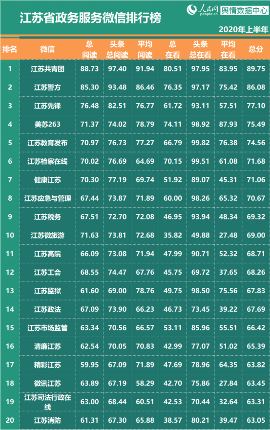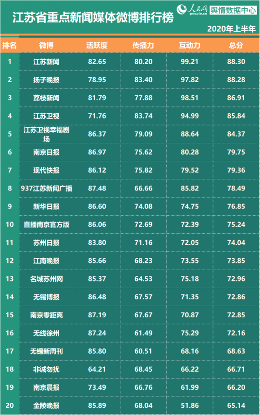 2020年8月,江蘇省委網(wǎng)信辦與人民網(wǎng)輿情數(shù)據(jù)中心聯(lián)合推出“2020年上半年江蘇省政務(wù)和重點新聞媒體微博微信排行榜”。