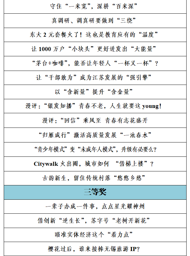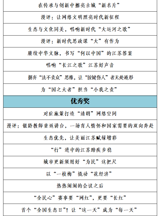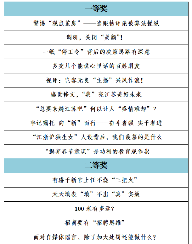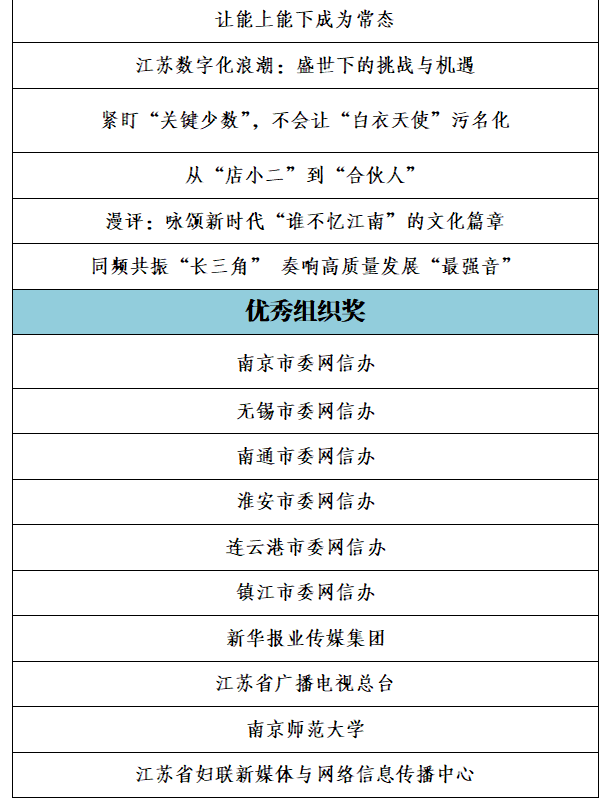 由中共江蘇省委網(wǎng)信辦、江蘇省新聞工作者協(xié)會聯(lián)合組織開展的第二屆紫金網(wǎng)絡評論大賽已完成評選工作。經(jīng)研究,現(xiàn)對擬確定的一、二、三等獎、優(yōu)秀獎和優(yōu)秀組織獎進行公示。公示時間為2023年12月29日至2024年1月8日。如對公示名單有異議,請在公示期內(nèi)向省委網(wǎng)信辦網(wǎng)絡傳播處反映。聯(lián)系電話:025—86292753;025—58683929。