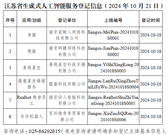 ◆ 江蘇省生成式人工智能服務(wù)已備案信息公告(10月12日)