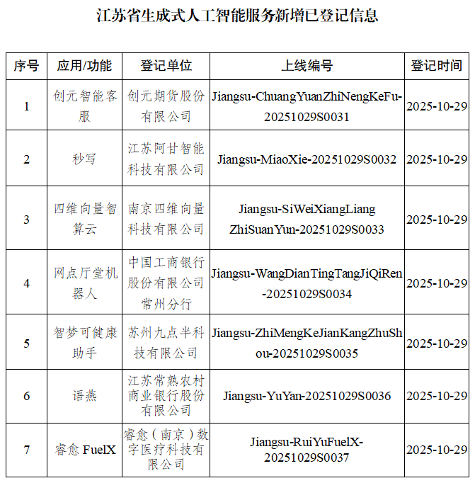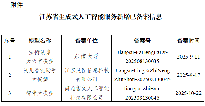 附件:江蘇省生成式人工智能服務新增已備案(登記)信息