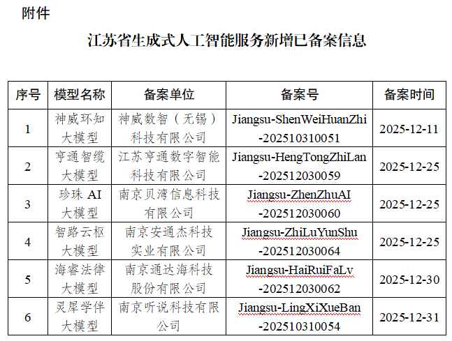 附件:江蘇省生成式人工智能服務(wù)新增已備案信息