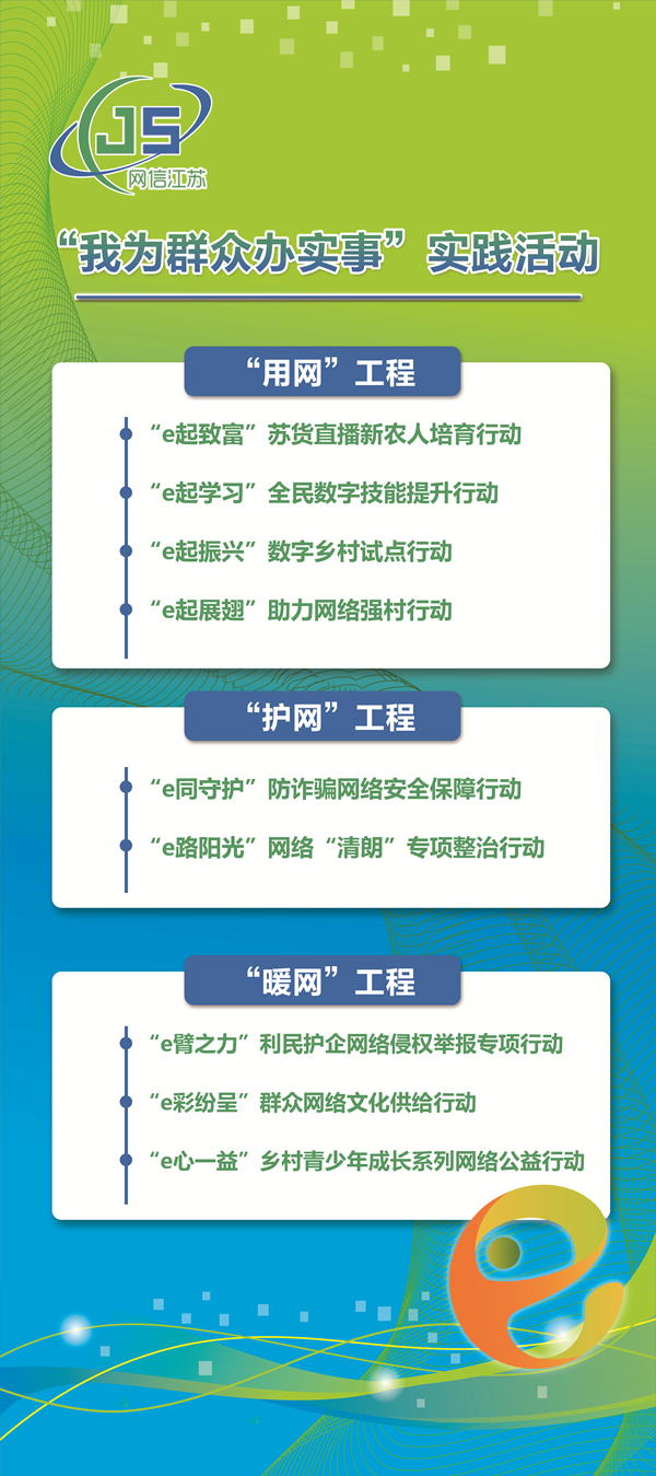 “我為群眾辦實(shí)事”實(shí)踐活動(dòng)開(kāi)展以來(lái),省委網(wǎng)信辦深入貫徹落實(shí)中央和省委部署要求,堅(jiān)持從最困難的群眾入手,從最突出的問(wèn)題抓起,從最現(xiàn)實(shí)的利益出發(fā),圍繞網(wǎng)絡(luò)賦能助力鄉(xiāng)村振興、筑牢網(wǎng)絡(luò)安全防線(xiàn)、走好網(wǎng)上群眾路線(xiàn)等方面,實(shí)施推進(jìn)“用網(wǎng)”“護(hù)網(wǎng)”“暖網(wǎng)”三大工程,組織開(kāi)展“e起致富”蘇貨直播新農(nóng)人培育行動(dòng)、“e起振興”數(shù)字鄉(xiāng)村試點(diǎn)行動(dòng)等“九個(gè)e”的具體工作。其中,“e起致富”蘇貨直播新農(nóng)人培育行動(dòng)被省委黨史學(xué)習(xí)教育領(lǐng)導(dǎo)小組辦公室列為“我為群眾辦實(shí)事”重點(diǎn)項(xiàng)目,年底前將構(gòu)建一套12門(mén)“互聯(lián)網(wǎng)營(yíng)銷(xiāo)師”培訓(xùn)課程體系,開(kāi)展30場(chǎng)助農(nóng)直播活動(dòng),幫助1萬(wàn)名以上新農(nóng)人提升直播專(zhuān)業(yè)技能,賦能網(wǎng)絡(luò)直播基地,打造5G直播示范場(chǎng)景,實(shí)施“玩嗨直播”項(xiàng)目,持續(xù)帶動(dòng)農(nóng)業(yè)增效、農(nóng)民增收、農(nóng)村致富。