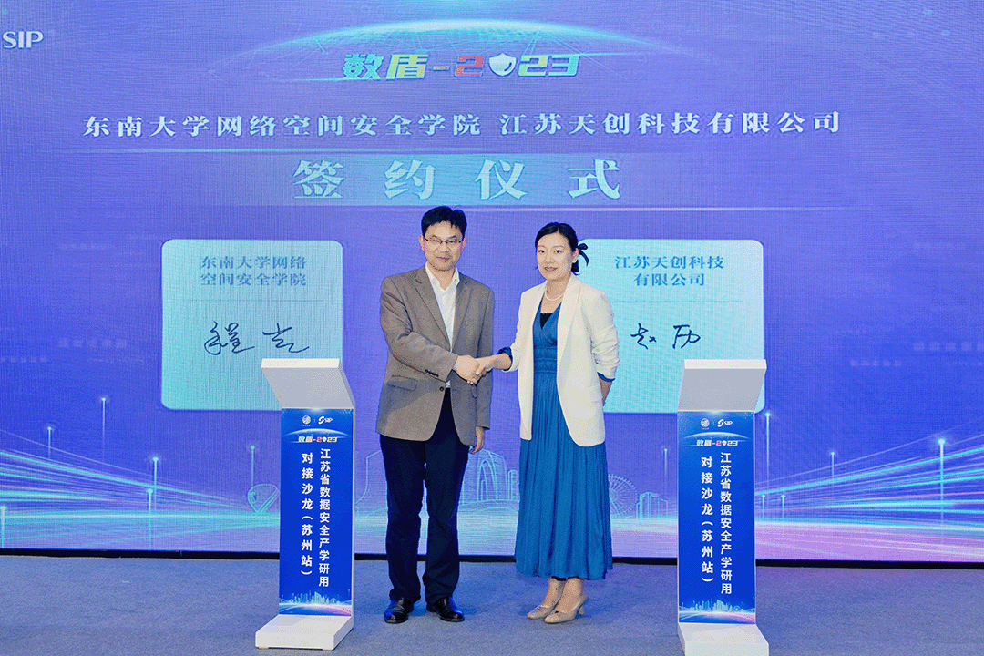 東南大學(xué)網(wǎng)絡(luò)空間安全學(xué)院與江蘇天創(chuàng)科技有限公司、蘇州工業(yè)園區(qū)與北京數(shù)風(fēng)科技有限公司簽約,探索數(shù)據(jù)安全政產(chǎn)學(xué)研用融合發(fā)展模式。