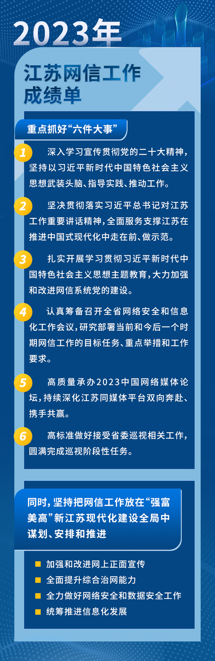 會議首先亮出2023年江蘇網(wǎng)信工作成績單。這一年,在省委堅強領導下,全省網(wǎng)信系統(tǒng)堅持把深入學習宣傳貫徹黨的二十大精神、習近平總書記對江蘇工作重要講話重要指示精神和開展學習貫徹習近平新時代中國特色社會主義思想主題教育,作為貫穿全年工作的主題主線,一體謀劃、一體部署、一體推進。認真貫徹落實全國全省宣傳思想文化工作會議、網(wǎng)信工作會議精神,在加強網(wǎng)絡內(nèi)容建設與管理、筑牢網(wǎng)絡安全屏障、發(fā)揮信息化驅(qū)動引領作用、強化黨的建設和干部隊伍建設中展現(xiàn)了新作為、取得了新成效。