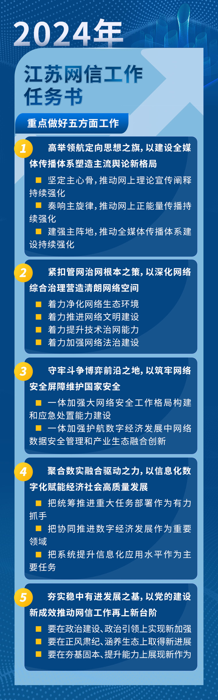 會議強調(diào),2024年是中華人民共和國成立75周年,是實現(xiàn)“十四五”規(guī)劃目標任務的關鍵一年,是習近平總書記提出網(wǎng)絡強國戰(zhàn)略目標10周年和我國全功能接入國際互聯(lián)網(wǎng)30周年。全省網(wǎng)信系統(tǒng)必須堅持以習近平新時代中國特色社會主義思想特別是習近平文化思想、習近平總書記關于網(wǎng)絡強國的重要思想為指導,全面貫徹落實黨的二十大精神和習近平總書記對江蘇工作重要講話重要指示精神,貫徹落實習近平總書記關于網(wǎng)信工作的重要指示和全國網(wǎng)信工作會議精神,深刻領悟“兩個確立”的決定性意義,堅持穩(wěn)中求進工作總基調(diào),完整準確全面貫徹新發(fā)展理念,牢牢把握“四個走在前”“四個新”重大任務,舉旗鑄魂強根基、服務大局強統(tǒng)籌、聚焦使命強擔當、從嚴求實強隊伍,發(fā)展壯大網(wǎng)上主流價值、主流輿論、主流文化,全力推動網(wǎng)信事業(yè)高質(zhì)量發(fā)展,更好服務和支撐江蘇在推進中國式現(xiàn)代化中走在前、做示范。