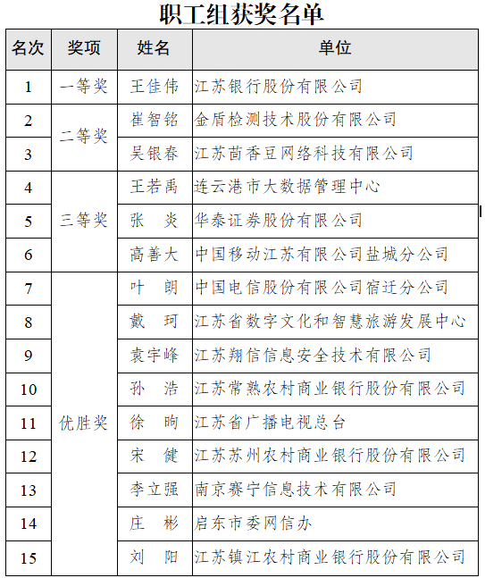 為深入貫徹落實《數(shù)據(jù)安全法》《個人信息保護(hù)法》等法律法規(guī),強化數(shù)據(jù)安全知識宣傳普及,加強數(shù)據(jù)安全人才隊伍建設(shè),提高各行業(yè)領(lǐng)域數(shù)據(jù)安全保障能力,夯實數(shù)字經(jīng)濟(jì)發(fā)展人才基礎(chǔ),省委網(wǎng)信辦、省教育廳、省工信廳、省公安廳、省數(shù)據(jù)局、省通信管理局于6至9月聯(lián)合舉辦了江蘇省第二屆數(shù)據(jù)安全技術(shù)應(yīng)用職業(yè)技能競賽。競賽包括初賽和決賽2個階段,區(qū)分職工組、教師組、學(xué)生組3個組別。按照決賽成績(已取消未通過電腦錄屏審查選手成績)排名,現(xiàn)將各組別獲獎名單予以公示。如有異議,請于公示期內(nèi)通過電話向競賽組委會反映,相關(guān)情況須真實客觀,并請?zhí)峁┫嚓P(guān)證明材料。