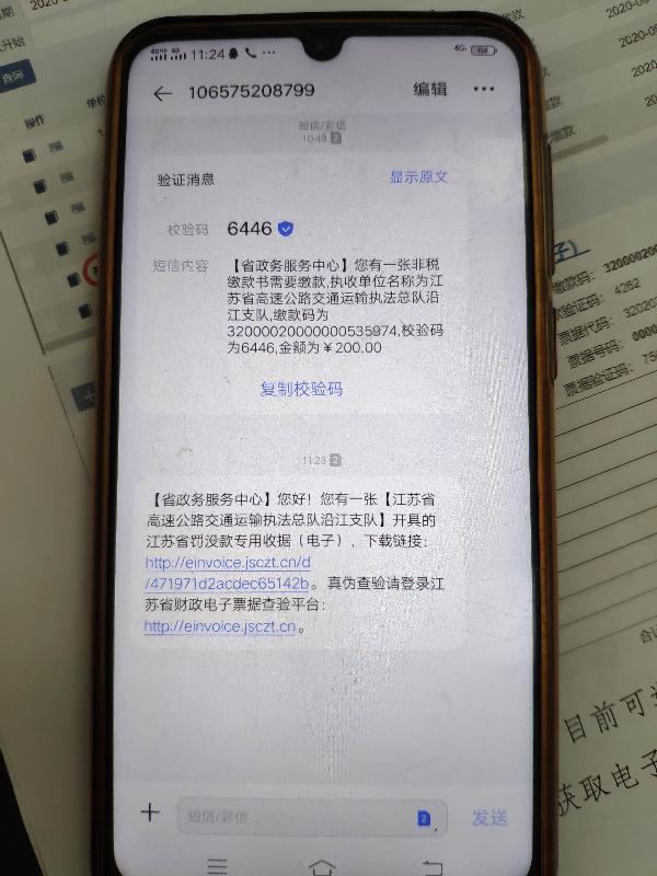 在大隊交通行政執(zhí)法人員的引導(dǎo)下,當事人通過手機接收到的短信網(wǎng)址登錄江蘇省財政電子票據(jù)查驗平臺,順利獲取一張電子罰沒款票據(jù)。