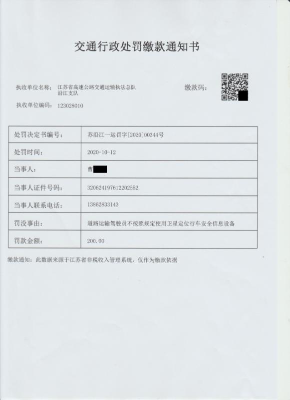10月12日上午,曹某違反《江蘇省道路運輸條例》第二十一條規(guī)定“道路運輸駕駛員不按照規(guī)定使用衛(wèi)星定位行車安全信息設(shè)備”,在沿江支隊第一大隊執(zhí)法服務(wù)中心通過微信掃碼的方式,成功繳納行政處罰款。