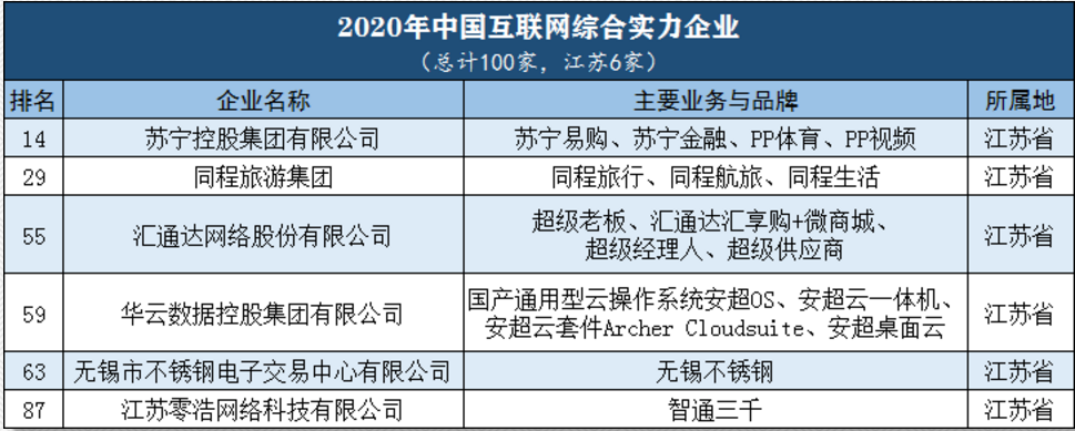 入選“百強(qiáng)”的江蘇企業(yè)中,蘇寧控股集團(tuán)有限公司排名最高,位列第14位,也是全國21家連續(xù)八年入選榜單的企業(yè)中我省的唯一一家。此外,同程旅游集團(tuán)、匯通達(dá)網(wǎng)絡(luò)股份有限公司、華云數(shù)據(jù)控股集團(tuán)有限公司、無錫市不銹鋼電子交易中心有限公司、江蘇零浩網(wǎng)絡(luò)科技有限公司也入選“百強(qiáng)”。