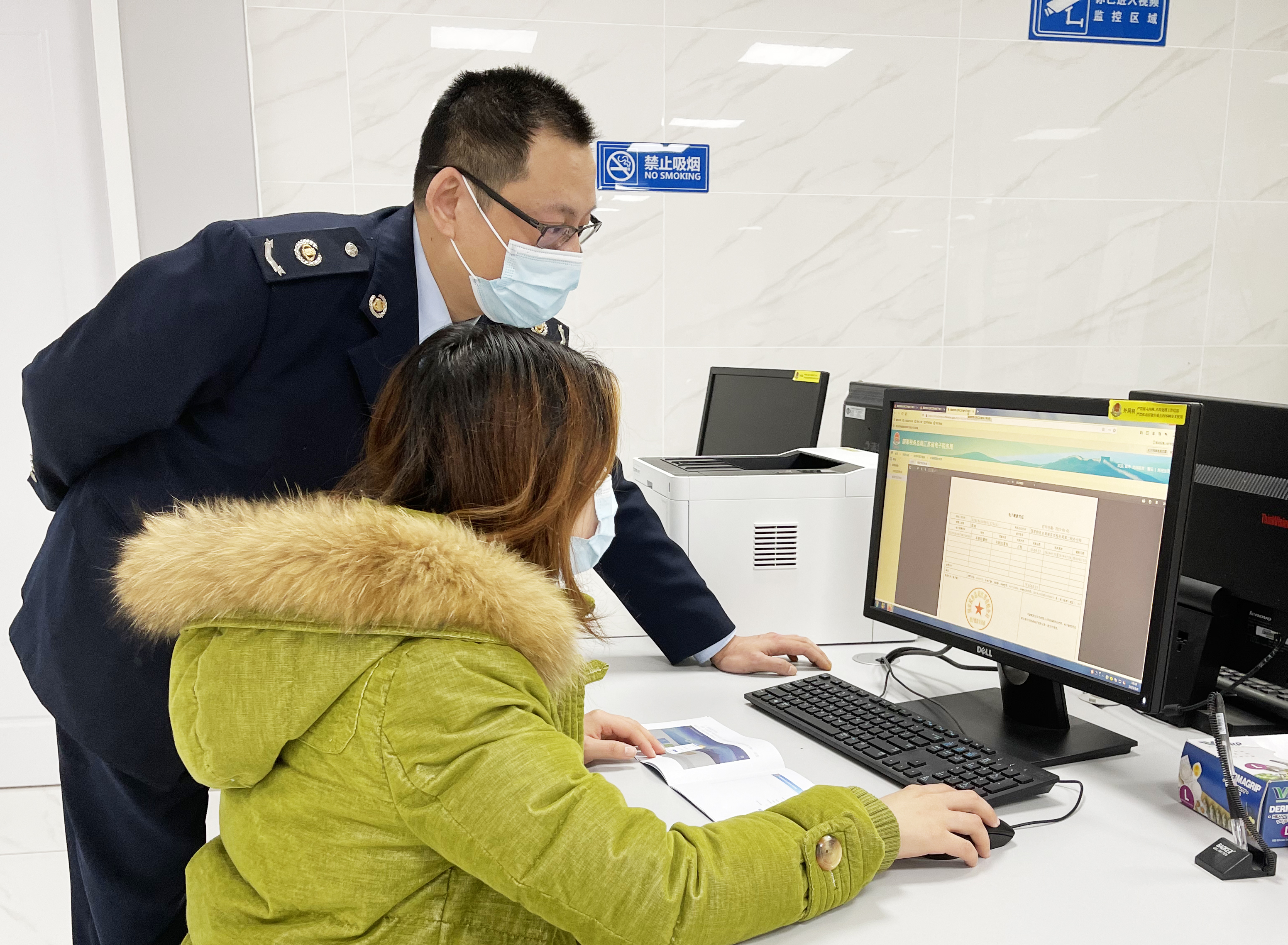 圖為稅務(wù)人員在指導(dǎo)納稅人辦理車購稅網(wǎng)上申報業(yè)務(wù)。