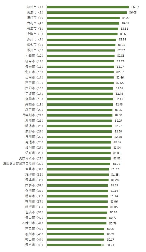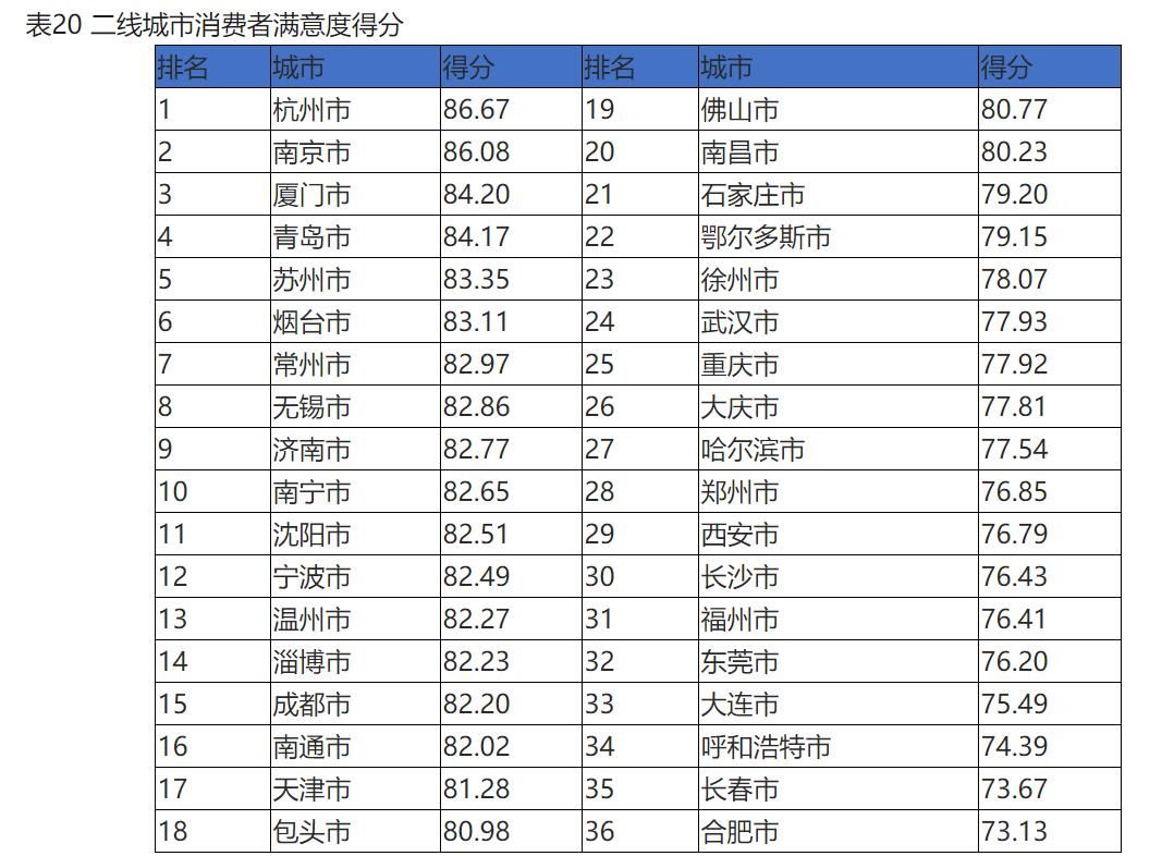 從地區(qū)對比和城市綜合表現(xiàn)來看,消費者滿意度仍然存在較大的地區(qū)間差異,除個別城市外,東部和南部城市、經(jīng)濟發(fā)展水平高的城市得分明顯要高于中西部及經(jīng)濟發(fā)展一般的城市;城市滿意度綜合得分排名總體穩(wěn)定,多數(shù)城市得分有所增長,杭州、南京、青島、廈門、吳忠、上海等城市消費者滿意度綜合得分排名靠前。