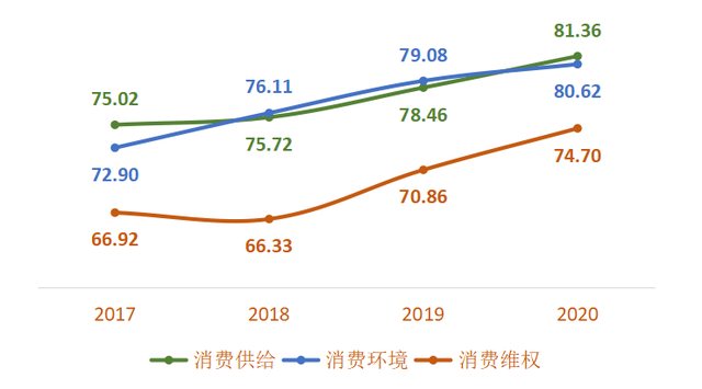 測評結(jié)果顯示,2020年100個城市消費者滿意度綜合得分為79.32分,相比于2019年100個城市消費者滿意度綜合得分提升2.3分。相比于2018年、2017年則分別提升5.64分和7.57分。