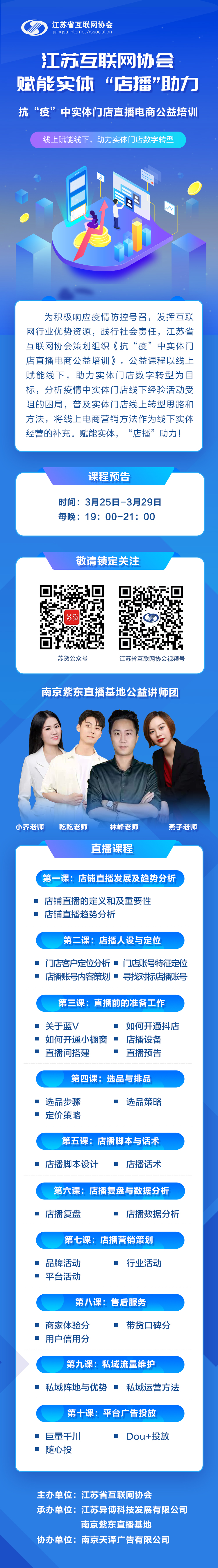 為積極響應(yīng)疫情防控號(hào)召,發(fā)揮互聯(lián)網(wǎng)行業(yè)優(yōu)勢(shì)資源,踐行社會(huì)責(zé)任,江蘇省互聯(lián)網(wǎng)協(xié)會(huì)策劃組織《抗“疫”中實(shí)體門店直播電商公益培訓(xùn)》。公益課程以線上賦能線下,助力實(shí)體門店數(shù)字轉(zhuǎn)型為目標(biāo),分析疫情中實(shí)體門店線下經(jīng)驗(yàn)活動(dòng)受阻的困局,普及實(shí)體門店線上轉(zhuǎn)型思路和方法,將線上電商營(yíng)銷方法作為線下實(shí)體經(jīng)營(yíng)的補(bǔ)充。賦能實(shí)體,“店播”助力!