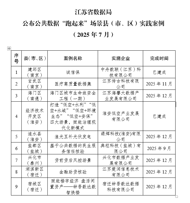 作為數(shù)據(jù)大省,江蘇又如何在推動公共數(shù)據(jù)“跑起來”方面走在前作示范?經企業(yè)自主申報、各地推薦與綜合評估,按照每個縣(市、區(qū))一次最多入選一個的要求,省數(shù)據(jù)局公布了首批公共數(shù)據(jù)“跑起來”場景縣(市、區(qū))實踐案例名單(2025年7月),覆蓋了誠信保、醫(yī)療高質量數(shù)據(jù)集、城市生命線安全工程、低空+水利等眾多領域。