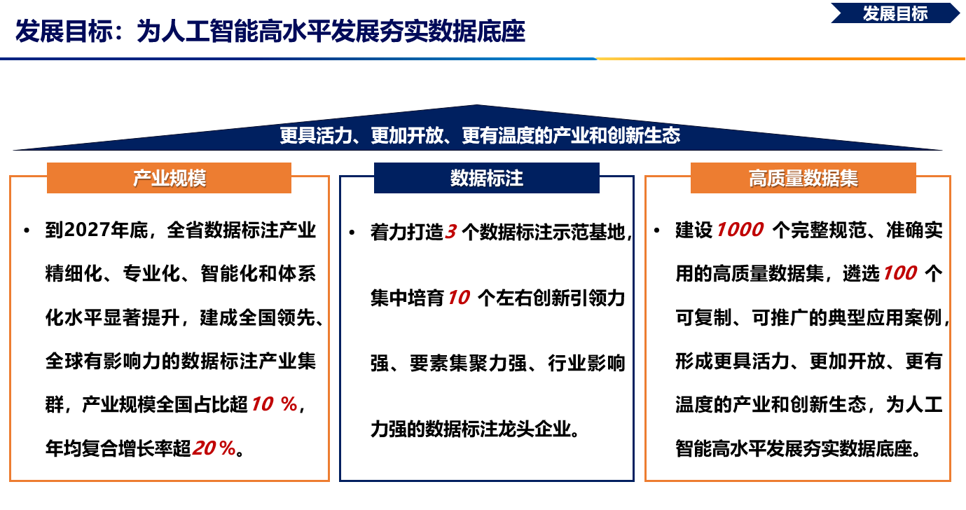 《方案》繪畫出了江蘇數(shù)據(jù)標注產業(yè)的“3年發(fā)展藍圖”:力爭到2027年底,全省數(shù)據(jù)標注產業(yè)精細化、專業(yè)化、智能化和體系化水平顯著提升,建成全國領先、全球有影響力的數(shù)據(jù)標注產業(yè)集群,產業(yè)規(guī)模全國占比超10%,年均復合增長率超20%。著力打造3個數(shù)據(jù)標注基地,集中培育10個左右創(chuàng)新引領力強、要素集聚力強、行業(yè)影響力強的數(shù)據(jù)標注重點企業(yè),建設1000個完整規(guī)范、準確實用的高質量數(shù)據(jù)集,遴選100個可復制、可推廣的典型應用案例,形成更具活力、更加開放、更有溫度的產業(yè)和創(chuàng)新生態(tài),為人工智能高水平發(fā)展夯實數(shù)據(jù)底座。