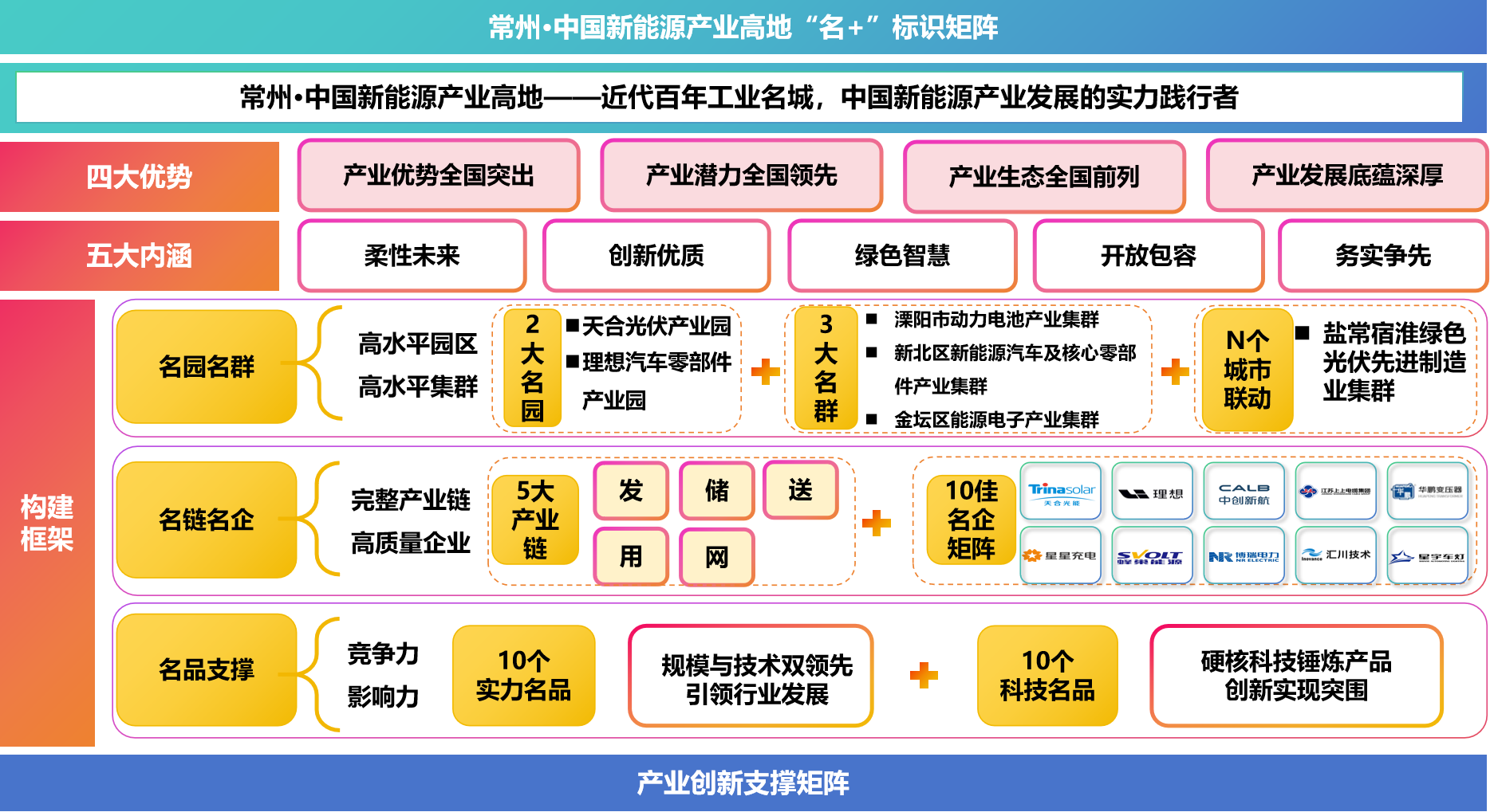 “名+”矩陣是支撐產(chǎn)業(yè)名片建設的基礎性、系統(tǒng)性工程,涵蓋名園名群、名企名品、名家名匠維度,并可延伸至更多領域,能反映企業(yè)經(jīng)營情況、產(chǎn)業(yè)規(guī)模實力、領域智力支撐等。按照區(qū)域(城市)產(chǎn)業(yè)名片理論體系,“名+”矩陣是組成城市產(chǎn)業(yè)名片競爭力的核心,也是建設提升城市產(chǎn)業(yè)名片影響力和美譽度的關鍵?!冻V荨ぶ袊履茉串a(chǎn)業(yè)高地“名+”矩陣報告》通過系統(tǒng)化的遴選標準和評估方法,全面構建常州在全國乃至全球的“名+”標識矩陣,助力引導新能源領域各優(yōu)質要素向常州集聚,展示提升常州新能源產(chǎn)業(yè)的核心競爭力和影響力,著力打造常州·中國新能源產(chǎn)業(yè)高地2.0深化版,為建設具有全球影響力的新能源產(chǎn)業(yè)高地提供戰(zhàn)略支撐。