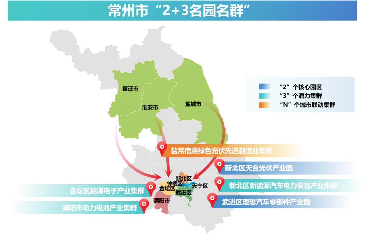 此次報告發(fā)布的常州“2+3”名園名群包括“新北區(qū)天合光伏產(chǎn)業(yè)園”和“武進區(qū)理想汽車零部件產(chǎn)業(yè)園”兩個地標名園、“金壇區(qū)能源電子產(chǎn)業(yè)集群”“溧陽市動力電池產(chǎn)業(yè)集群”“新北區(qū)新能源汽車電氣設備產(chǎn)業(yè)集群”3個特色名群。對標國際國內(nèi)先進新能源園區(qū)和集群,它們在產(chǎn)業(yè)規(guī)模和集聚度、產(chǎn)業(yè)鏈條的完整度和協(xié)同性維度具備較強優(yōu)勢?!胞}常宿淮綠色光伏先進制造業(yè)集群”構建起一套完整的光伏產(chǎn)業(yè)鏈體系,總產(chǎn)值占全國比重超1/5,是國家先進制造業(yè)集群,同樣表現(xiàn)亮眼。