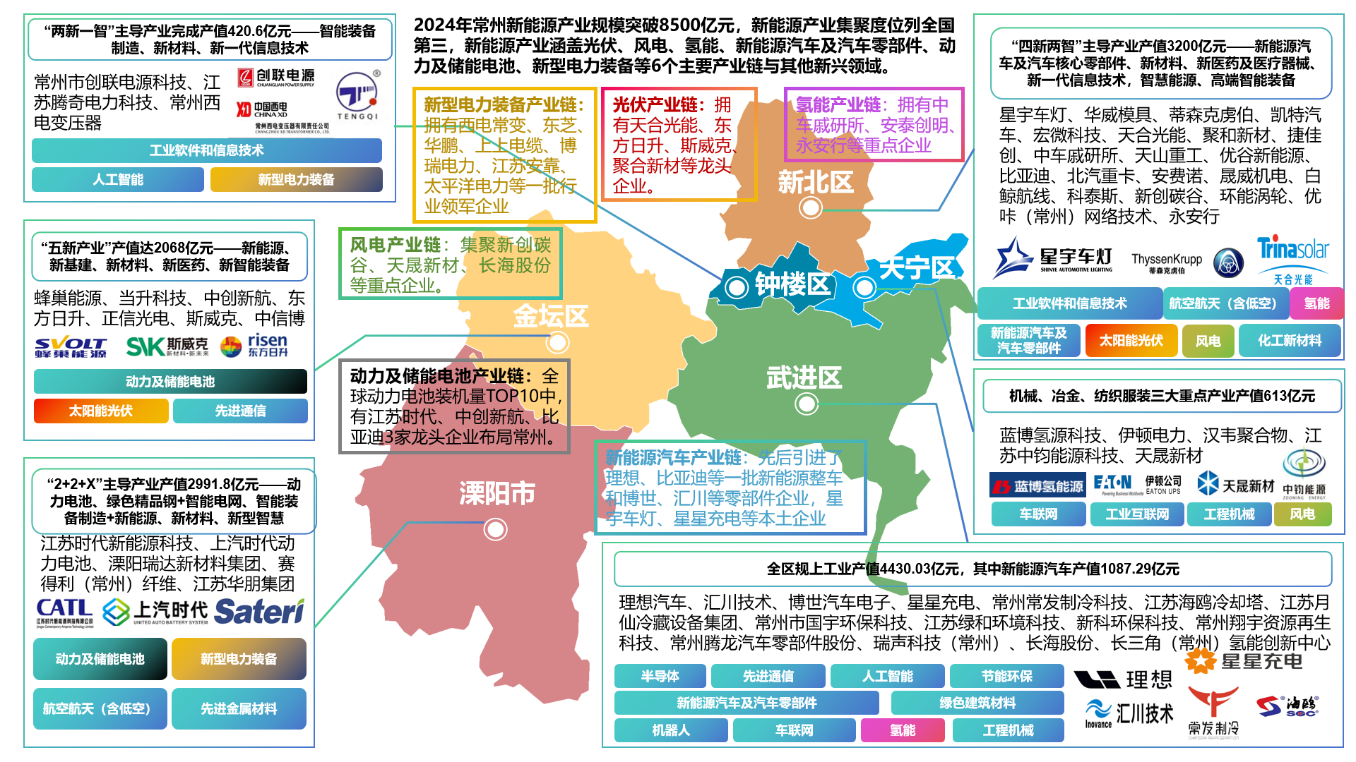 從產(chǎn)業(yè)規(guī)模這一視角切入,可見常州如何做大發(fā)展空間、促進良性競合。2024年,常州市新能源產(chǎn)業(yè)規(guī)模突破8500億元,占規(guī)上工業(yè)產(chǎn)值近一半;動力電池產(chǎn)量占全國15%,變壓器產(chǎn)量占全國13%,電纜產(chǎn)量占全國6%……再看領軍企業(yè)和園區(qū)集群,常州集聚理想汽車、比亞迪、江蘇時代等一眾龍頭企業(yè),新能源領域百億工業(yè)企業(yè)(集團)達11家;新型碳材料集群、鹽常宿淮綠色光伏先進制造業(yè)集群入列國家先進制造業(yè)集群,溧陽市動力電池、新北區(qū)新能源汽車電氣設備、金壇區(qū)能源電子成為國家中小企業(yè)特色產(chǎn)業(yè)集群。憑借領先性產(chǎn)業(yè)規(guī)模、成長性優(yōu)質企業(yè)、特色性園區(qū)集群以及高效性協(xié)同機制,常州近年來在全國范圍內(nèi)基本確立起新能源行業(yè)“高地”地位。