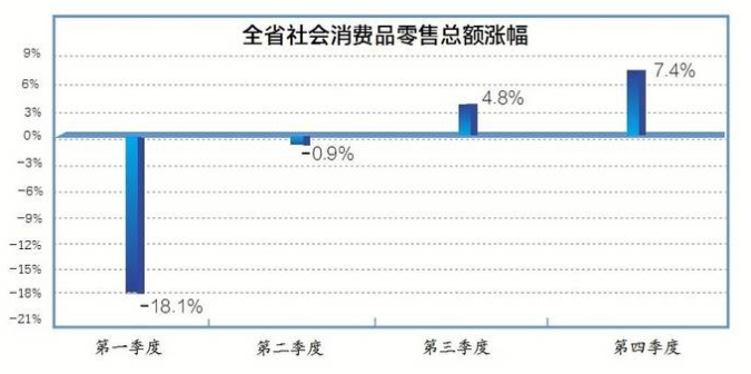 “穩(wěn)”——來(lái)自省統(tǒng)計(jì)局貿(mào)易外經(jīng)統(tǒng)計(jì)處的數(shù)據(jù)顯示了消費(fèi)市場(chǎng)穩(wěn)步回升的趨勢(shì)。去年一季度,社會(huì)消費(fèi)品零售總額大幅下降18.1%;其后,伴隨各項(xiàng)政策舉措逐漸落地生效、市場(chǎng)主體有序復(fù)工復(fù)產(chǎn)、居民消費(fèi)需求穩(wěn)步釋放,僅到二季度,全省社會(huì)消費(fèi)品零售總額降幅就大幅收窄至0.9%。在此基礎(chǔ)上,下半年消費(fèi)品市場(chǎng)回暖趨勢(shì)進(jìn)一步明朗,不僅社會(huì)消費(fèi)品零售總額季度增速浮出水面,而且三、四季度還分別增長(zhǎng)4.8%與7.4%。