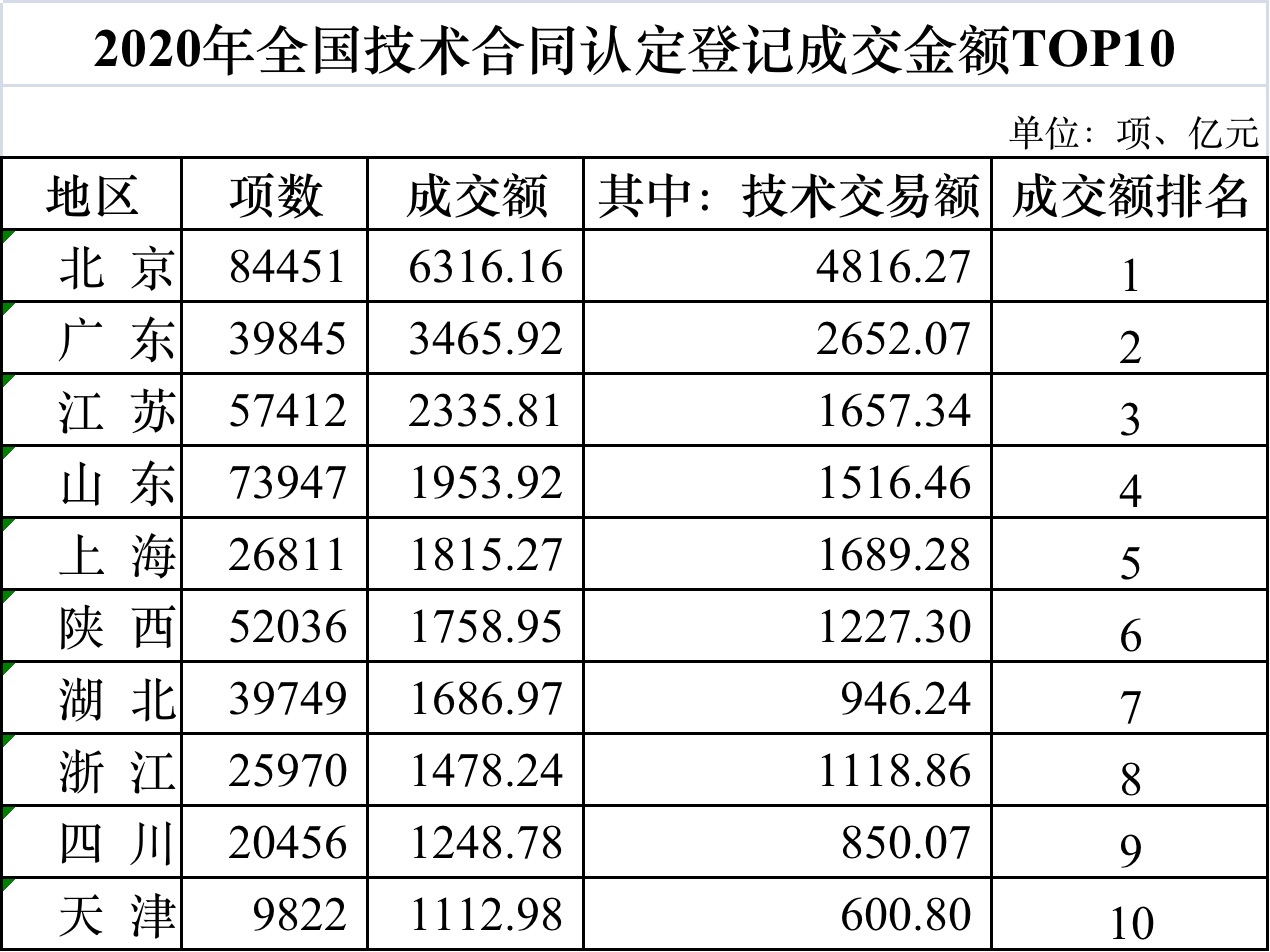 技術(shù)合同成交額是衡量科技成果轉(zhuǎn)化的重要指標(biāo)。全國技術(shù)合同認(rèn)定登記成交金額居前十位的省市依次為北京、廣東、江蘇、山東、上海、陜西、湖北、浙江、四川和天津。