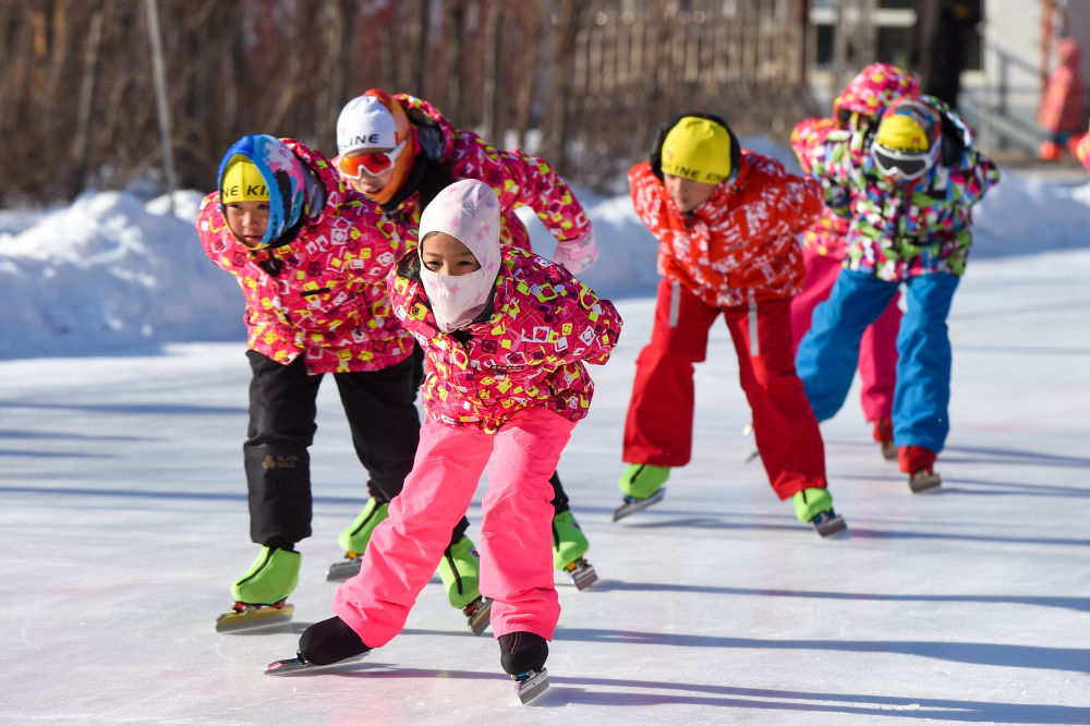 1月13日,在吉林省四平市六馬路小學(xué),學(xué)生們?cè)诒鶊?chǎng)上滑行。新華社記者 張楠 攝