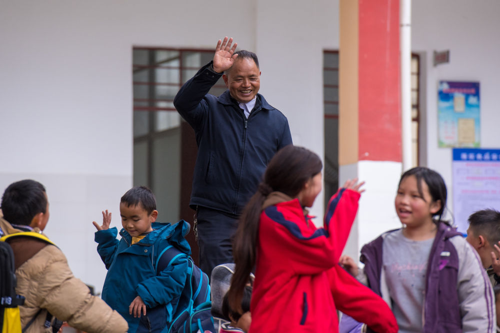 2025年2月18日,在落松地小學,農(nóng)加貴(中)下課后和學生揮手告別。新華社記者 彭奕凱 攝